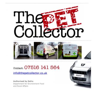 Welcome to The Pet Collector. Formed in 2012 The Pet Collector are an Animal Ambulance/Pet and Taxi/Pet Tansportation business. The Pet Collector services include, local and nationwide pet transportation, emergency call out, pet bereavement and cremation. The Pet Collector are DEFRA/AHVLA authorised for transportation and Certified Canine First Responder for first aid. The Pet Collector are fully insured for your peace of mind. Most importantly The Pet Collector are animal lovers who care for your pets as if they were ours.